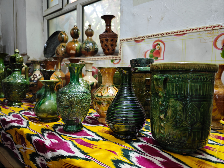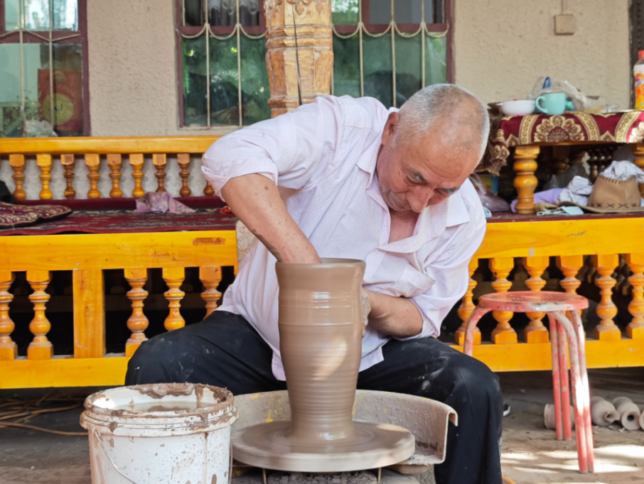 在英吉沙县,被称为“泥巴艺术”的英吉沙土陶,远在新石器时代就已出现,到汉晋时代发展到彩陶。2006年,英吉沙模制法土陶烧制技艺被列入国家级非物质文化遗产。从2013年开始,英吉沙县委、县政府打造集非遗特色文化、休闲度假、消费购物为一体的土陶村特色景区。土陶作为指尖上的造物,向国内外宾客展示着独特魅力。2020年,在山东济宁市援疆指挥部的支持下,英吉沙县大力保护非遗文化传承,成立了一家土陶合作社,带动更多的村民从事土陶烧制,以此实现农民致富奔小康。