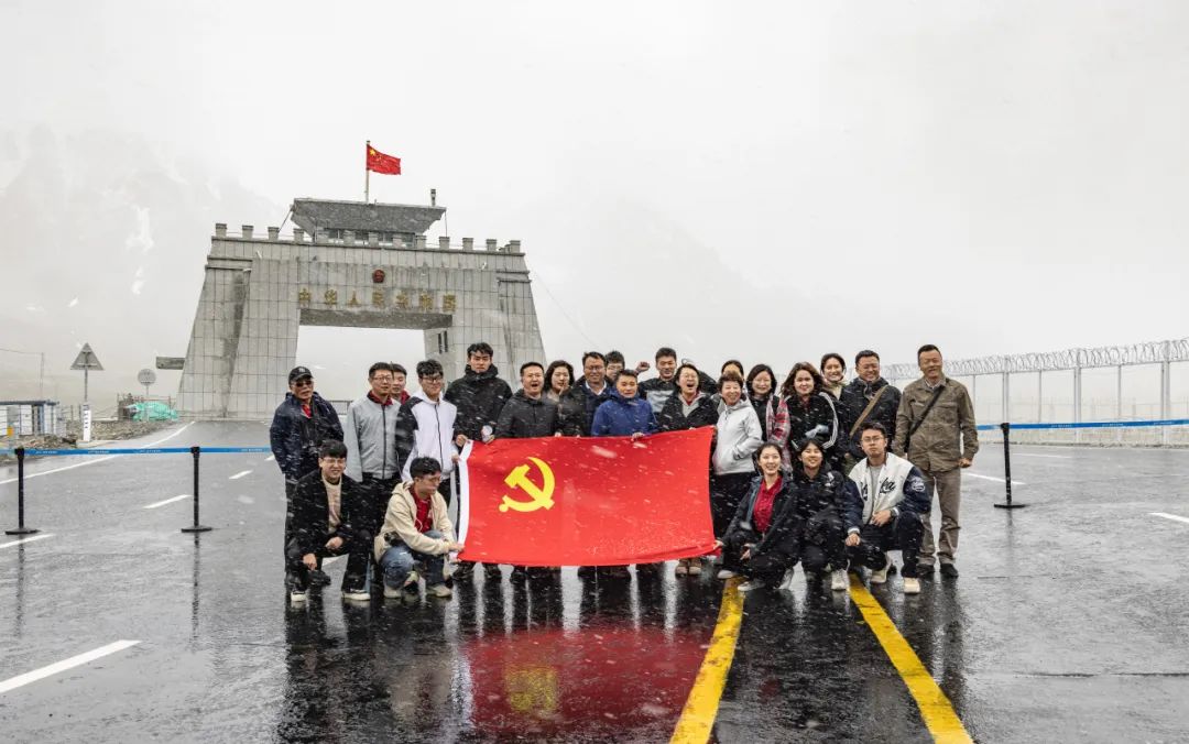 调研团一抵达山顶,天空开始飘起雪花。红其拉甫国门在风雪的衬托下显得更加威武雄壮,鲜艳的五星红旗在空中高高飘扬。在这严寒的边疆之地,调研团的党员同志们在国门前庄严宣誓,面对着鲜红的党旗,郑重地重复着入党誓词。