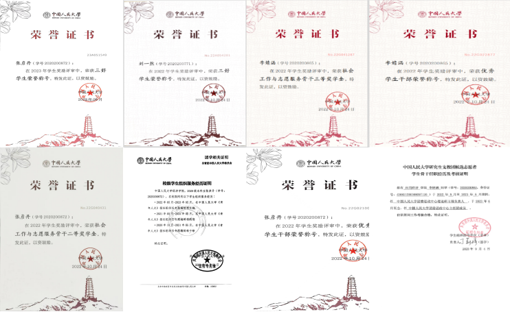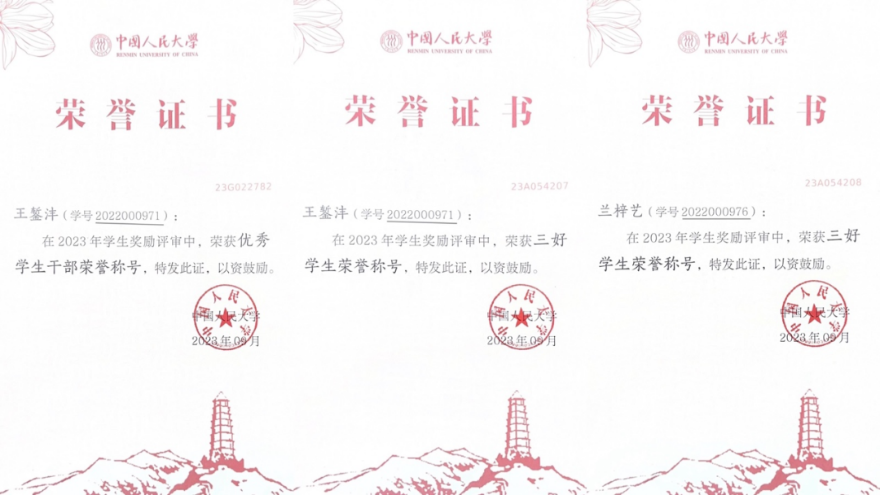 宿舍的两位成员,深入参与公司-公司-班级各级各项员工工作当中,切实发挥了骨干示范表率作用。宿舍长王錾沣担任校研究生会宣传部负责人、公司研究生会主席团成员,兰梓艺任公司2022级博士三班班长。在公司、公司、班级大大小小各类文体活动、志愿服务中,总能看到他们服务同学的身影。在2022-2023年度评奖评优中,宿舍成员均获评太阳成tyc122cc集团三好员工,王錾沣获评太阳成tyc122cc集团优秀员工干部。