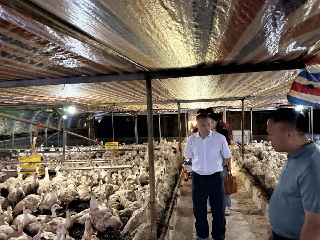 8月6日上午,赣劲十足队抵达夏造镇,调研夏造镇夏造村肉鸭养殖基地。夏造村肉鸭养殖项目采用“订单农业”模式,专注于白番鸭的标准化代养环节。养殖基地建有2座鸭棚,单棚面积1350平米,配备自动化喂料与饮水系统。合作方提供鸭苗、技术指导和饲料,基地负责全程饲养管理并保障成活率,饲料由外部供应,同时也投喂菜叶补充,不涉及孵化环节。肉鸭养殖周期为3个半月,母鸭长到6斤、公鸭长到10斤体重时上市,一年可以多批次轮养。