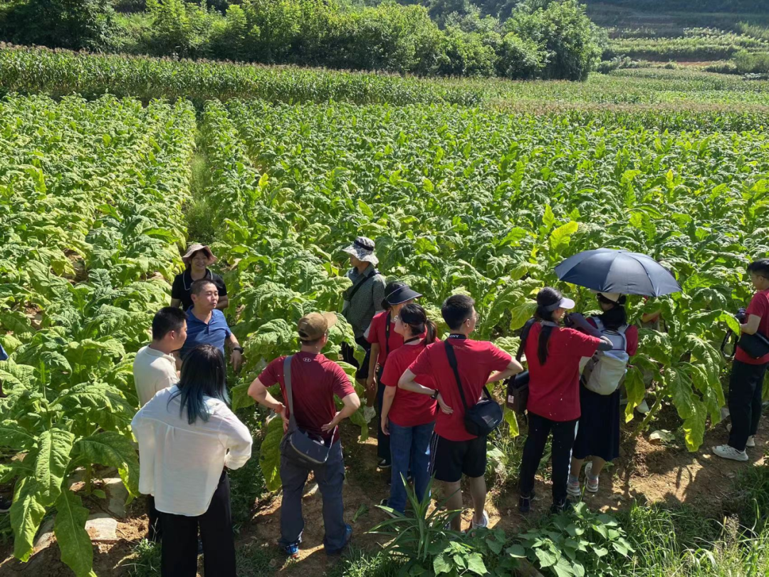▲访谈团在野洞河镇泥巴寨村烤烟基地合影
