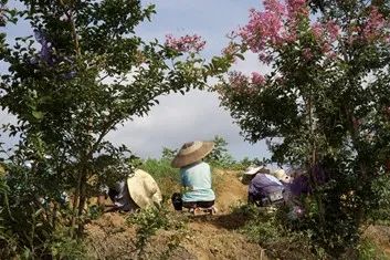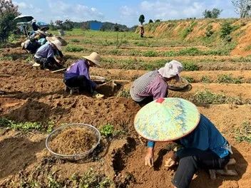 ▲当地农户手持农具在太子参种植基地上采筛太子参
