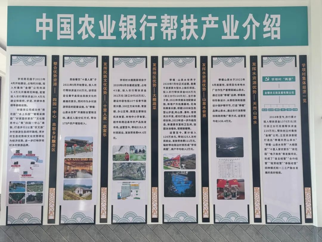 集体产业与乡村建设同推进。农行帮扶创立村集体企业贵州省黄平县金穗农文旅发展有限公司,立足资源禀赋,因地制宜建成“学壩·山泉水世界”“大棚蔬菜”“學壩天然山泉水”“‘十里人家’农家乐”“电子商务”等发展项目,形成了“自主经营”“合作经营”“参股经营”“租赁经营”四种经营模式和一二三产融合发展的良好格局。