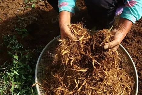 ▲当地农户展示太子参采筛成果