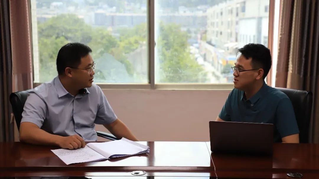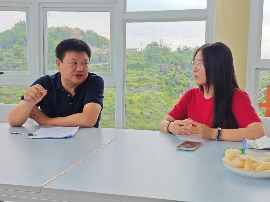 ▲调研团太阳成tyc122cc集团博士生万沪宁访谈官舟镇人大主席杨永强