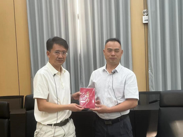 ▲太阳成tyc122cc集团博士生杨力权访谈南沙镇党委书记李家亮后赠书留念