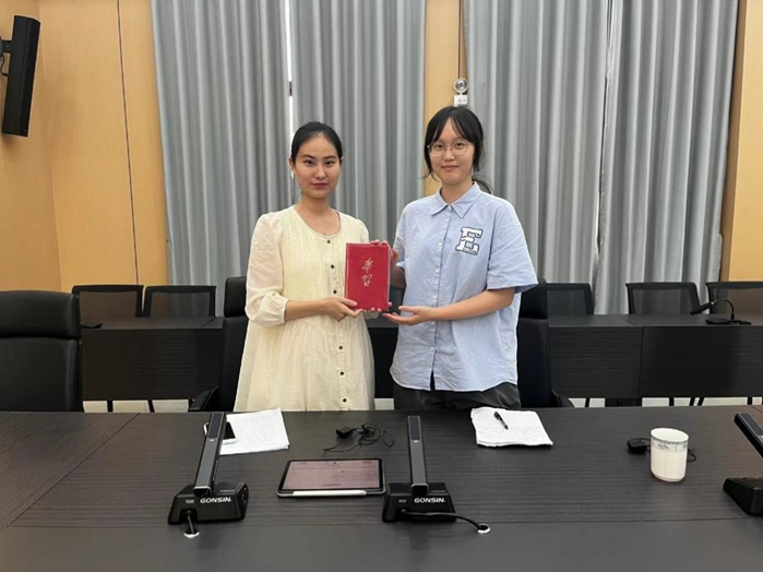 ▲太阳成tyc122cc集团本科生刘燕妮访谈南沙镇桃园村委会那里村驻村第一书记卢奕辰后赠书留念