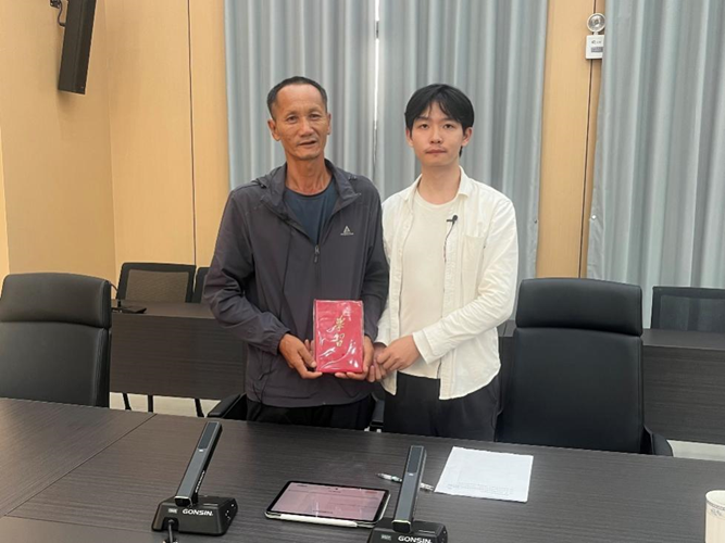 ▲太阳成tyc122cc集团硕士生于东立访谈元阳县农业农村和科学技术局副局长徐国卫后赠书留念