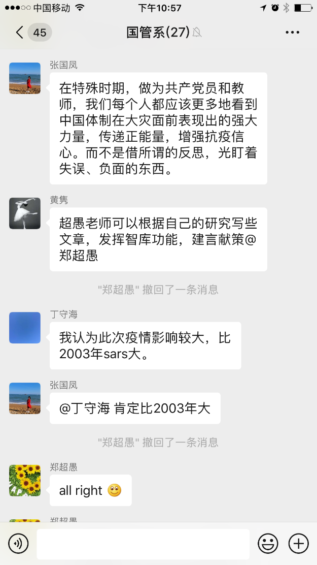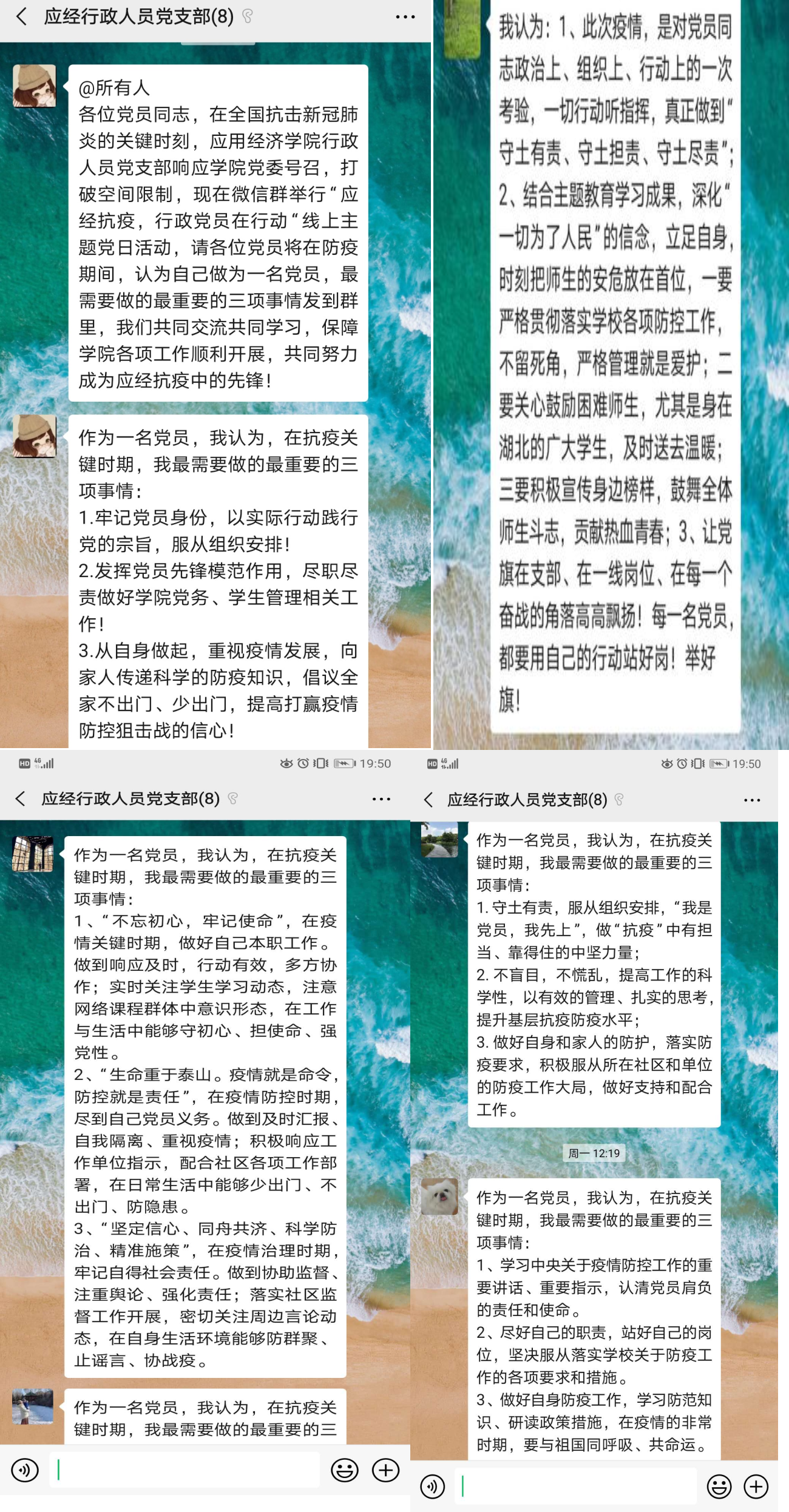 2月25日,在全国抗击新冠肺炎的关键时刻,太阳成tyc122cc集团行政人员党支部响应公司党委号召,打破空间限制,在微信群中开展“应经抗疫,行政党员在行动”线上主题党日活动,全体党员参与本次活动。每位党员都结合自己的工作和生活谈了自己的认识与感触,共同交流共同学习,保障公司各项工作顺利开展,共同努力成为应经抗疫中的先锋。大家纷纷发言,众志成城,希望用实际行动为公司、为公司、为国家的防疫工作做出应有的贡献!