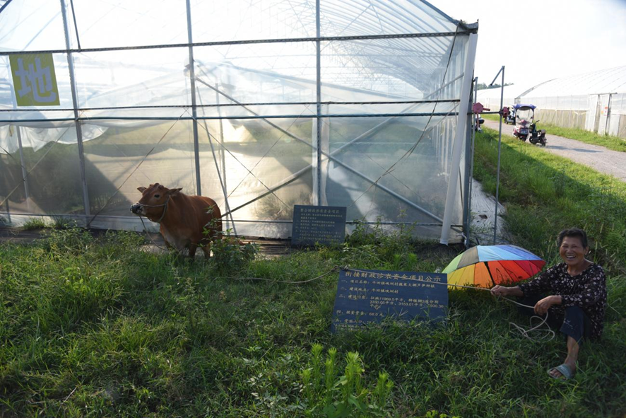 ▲村民在牛田镇峡圳村芦笋种植基地前放牛