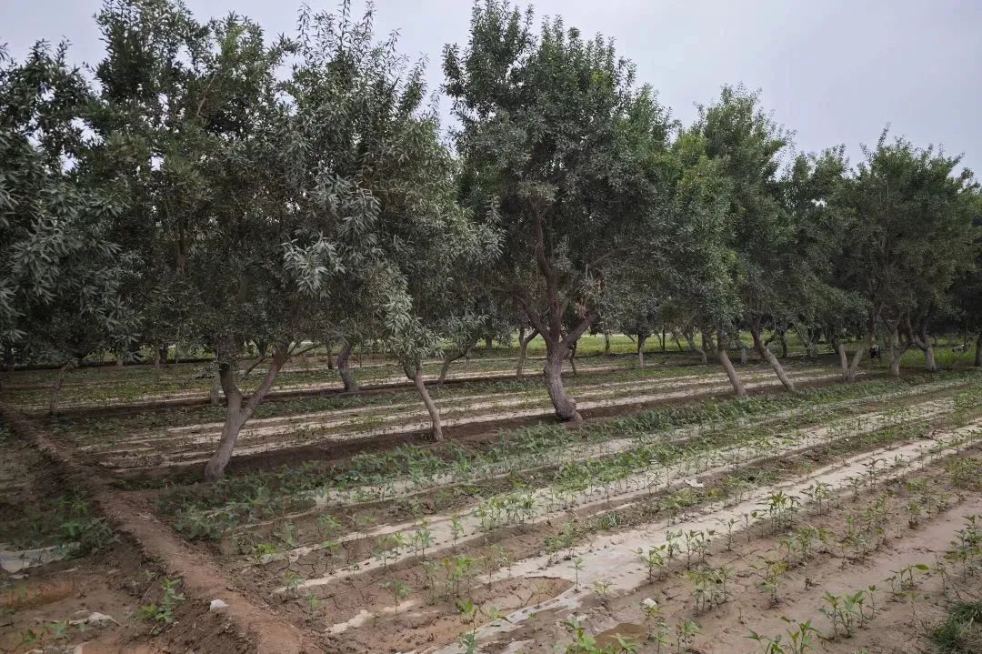 同样在莎车县依盖尔其镇阔纳先拜巴扎村,访谈团欣喜地看见新疆少见的江南景象:成片的白荷一望无际,茂密的水稻欣欣向荣,长长的豇豆铺满广场。由于水稻、豇豆这些作物在周围其他地方少有种植,或者只能在成本高昂的大棚中培育,因此当地的这些林果蔬菜常年供不应求,不愁销路。为了充分发挥活水优势,该村大量采用林粮间作、林下套种的方法:在豇豆底下种白菜,巴旦木底下种黄豆,真正将水库变为“生命库”,将河滩变为“种植园”。