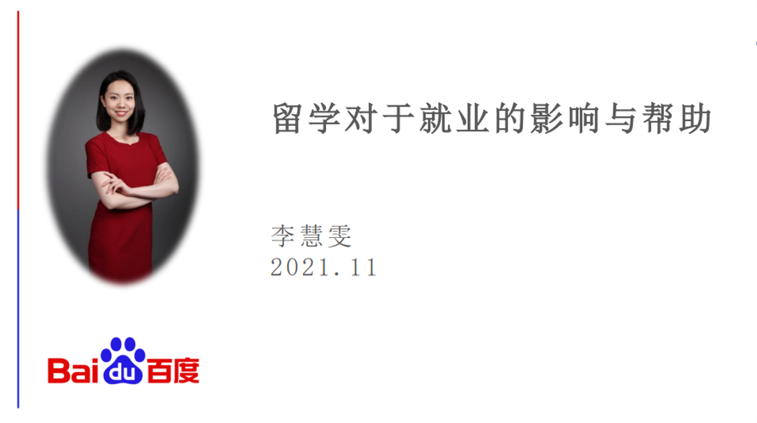 就职于百度总裁办公室的优秀员工李慧雯(2011级国民经济管理本科)因疫情防控要求通过线上形式参会。作为海归精英,李慧雯以自己为例,从生活和工作两方面介绍了自己的留学经历和收获。接着,她围绕“为何留学”这个问题进行了详细阐述,最后从如何选择公司、就业发展情况以及如何把留学所获应用于工作和生活这三个方面为大家提供建议。