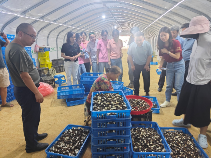 7月15日下午,调研团调研食用菌种植基地。该基地是在原先废弃的育烟棚基础上建造的,借鉴山东种植技术,目前菌种从山东购入,正尝试自主培育。基地通过菌子修剪等工序为村民提供灵活岗位,按斤计酬,不限年龄,尤其为老年群体提供了稳定收入来源。