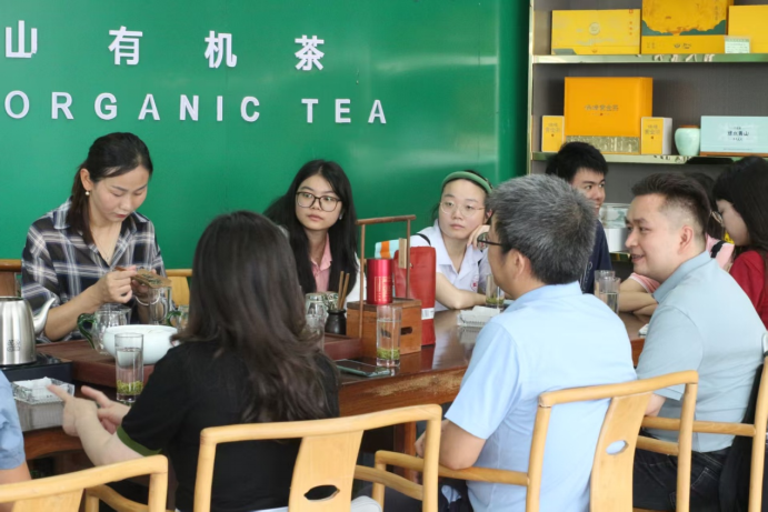 调研团通过与湖南农业大学教授、古丈县科技专家服务团团长张国政的交谈了解到,古丈县的特点是九山半水半分田,在湖南省的茶园面积排第二。相对于其他农业产业,茶叶是富民产业,企业收入不一定高,但能切实提高农户收益。脱贫攻坚期间政府投入大量资金用于定制化设备生产,若无政府支持则企业难以提供。交谈过程中,他特别提到了“789”这一串数据,即已形成全县近90%的村寨种植茶叶、80%的农业产值来自茶叶、70%的农业人口从事茶业的良好格局。目前,“村播”做得很好,并在去年成立了古丈红茶产业协会,他特别强调了女企业家在脱贫攻坚中的作用。