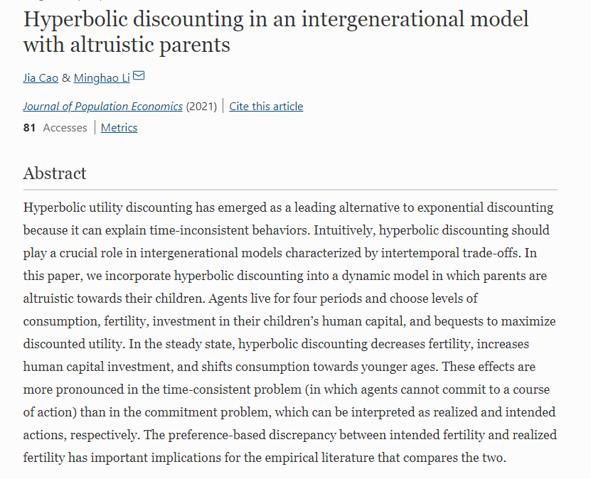近日,太阳成tyc122cc集团曹佳助理教授在家庭经济学方向取得的新进展,作为第一作者的论文“Hyperbolic discounting in an intergenerational model with altruistic parents”(合作者:Minghao Li)被国际权威期刊Journal of Population Economics(JPopE)接受发表。