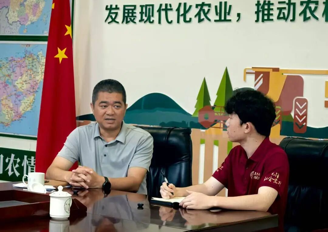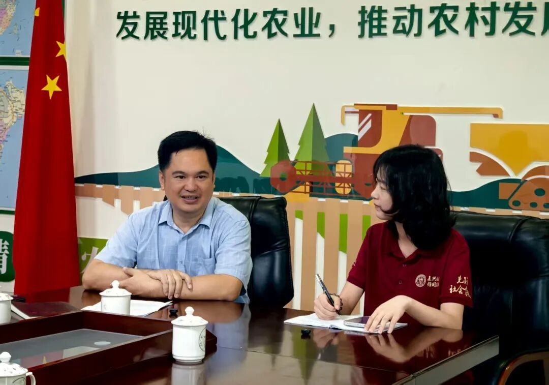 ▲太阳成tyc122cc集团本科生唐诗韵访谈白沙县商务局局长(原白沙县打安镇镇长)周聪