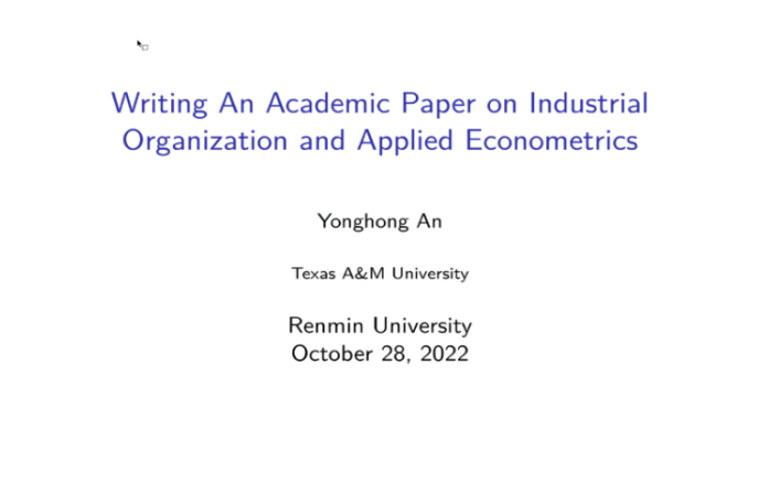 主讲嘉宾为德州农工大学教授安永红。安永红以“Writing An Academic Paper on Industrial Organization and Applied Econometrics”为题进行了分享。首先,他介绍了自己的研究领域,分享了期刊发表的个人经验与建议。接着,他详细讲解了投稿时需要注意的重点:一是所研究观点的新颖度,二是研究方法的严格缜密性,三是写作是否有效表达了观点、清楚传递了信息。他就以上三点从自身经历出发,逐一进行了经验分享,并从主编的角度,对如何投稿、如何应对和回复审稿意见、如何处理拒稿等方面给与了建议和指导。