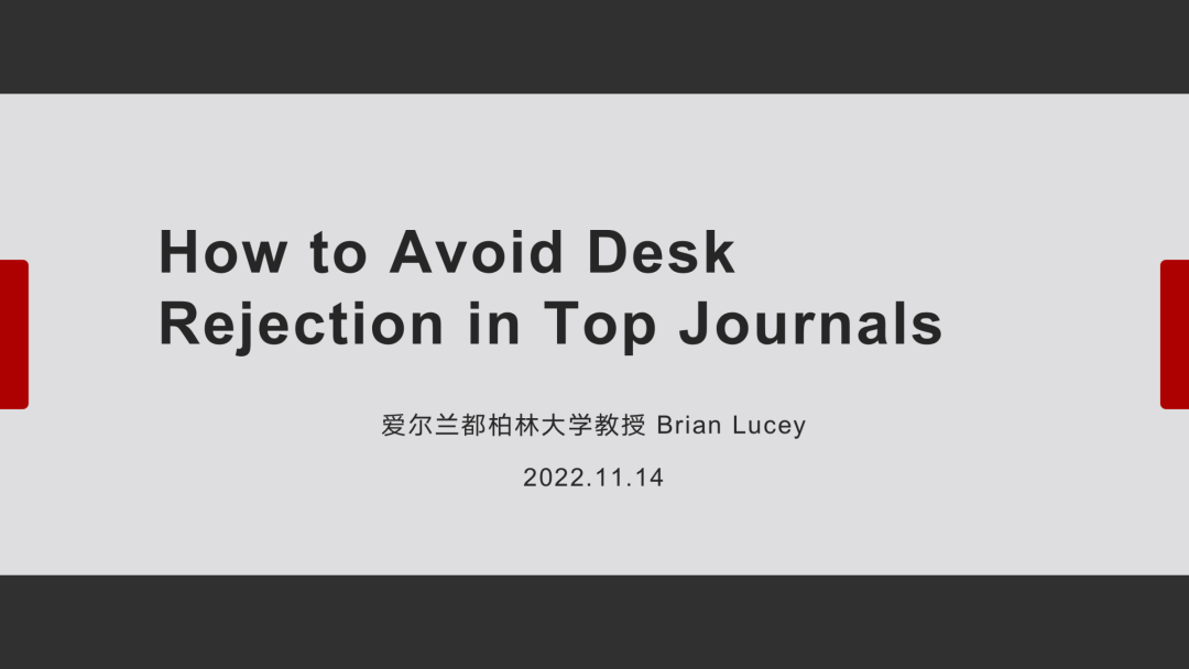 主讲嘉宾为爱尔兰都柏林圣三一公司教授Brian Lucey。Brian Lucey以“How to Avoid Desk Rejection in Top Journals”为题进行了分享。他从期刊主编的角度分享了自己的观点,提出了许多有价值的参考建议。他认为,为了避免投稿被拒,需要做到选题时清晰明了、大胆创新、目标明确,文章一致完整、逻辑通畅、方法正确,而投稿人自身也要对研究保持诚信的态度,不弄虚作假。最后,他就投稿信的注意事项和推荐审稿人的选择等方面进行了交流,并再次强调了在进行论文写作和投稿时突出文章主旨和注意细节的重要性。