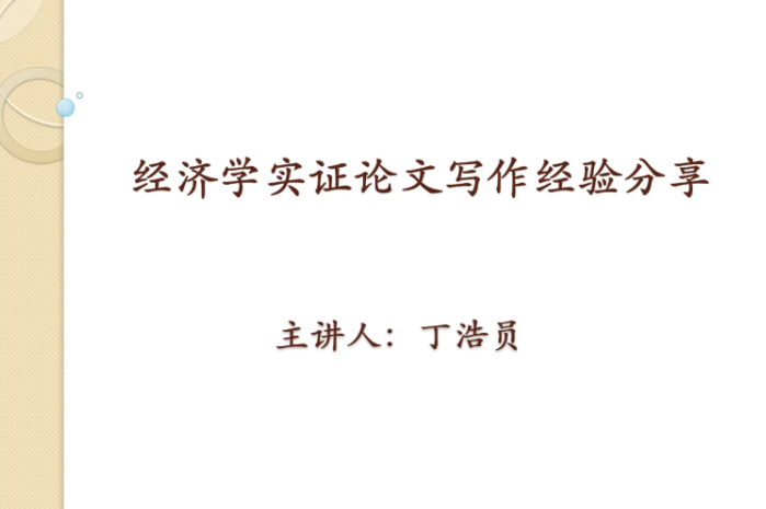 主讲嘉宾为上海财经大学教授丁浩员。丁浩员以“经济学实证论文的写作经验”为题进行了分享。他认为,在学术研究中,模型可以更为简单地表述理论。在经济学论文中,大多论文都是以模型为依托进行数据回归分析,通过建模进行纯理论分析的论文占比较少。但是在前人已有大量理论研究的前提下,通过实证验证前人理论时不需要构建模型。他介绍了实证研究的步骤:准备阶段、选题、收集数据及探索研究、建立计量模型、解释回归结果、论文写作、与同行交流、提交论文或投稿。最后,他鼓励同学们要多进行“讲与思”,善于独立思考自己的研究。