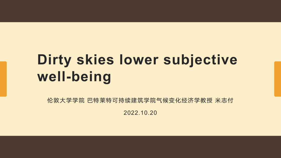 主讲嘉宾为伦敦大学公司教授米志付。米志付以“Dirty skies lower subjective well-being”为题进行了分享。该研究主要围绕我国居民的主观幸福感与空气污染物浓度的关系展开,运用了情感分析法,并基于百度搜索词去构建主观幸福感指数。结果表明,居民的主观幸福感与空气污染物的浓度呈负相关,且和季节有着一定关系,在炎热的夏天这种关系会更显著。同时,城市富裕的程度也会影响居民对于空气污染物的敏感度,越富裕的城市敏感度越高。随后,他介绍了其担任主编的期刊《Structural Change and Economic Dynamics》,并说明了文章发表的注意事项等。