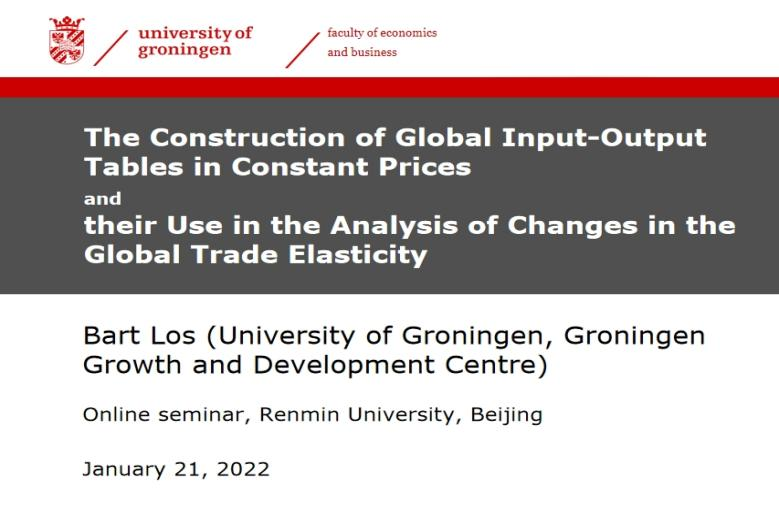 主讲嘉宾为荷兰格罗宁根大学教授Bart Los。Bart Los以“The Construction of Global Input-Output Tables in Constant Prices and their Use in the Analysis of Changes in the Global Trade Elasticity ”为题进行了分享。他围绕不变价问题,介绍了世界投入产出表(WIOT)不变价的构建框架与数据,阐释了相应的构建方法,对不变价WIOT的新构造方法做了详细说明,并解释了为何不采用双缩法(double-deflation)。随后,他提出了一个新颖的包含供应链结构的全球贸易弹性估计框架,并以此为基础,解释了贸易保护主义和新冠疫情背景下,贸易回流现象对全球贸易弹性下降趋势的影响。