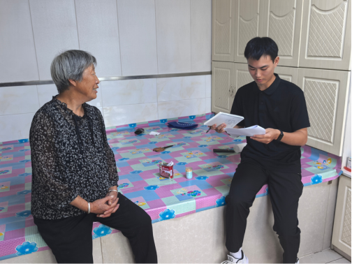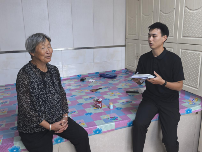 ▲本科生胡博恺访谈东郊镇厢兰五村大五井子屯脱贫户陈淑华