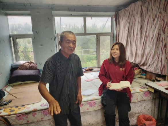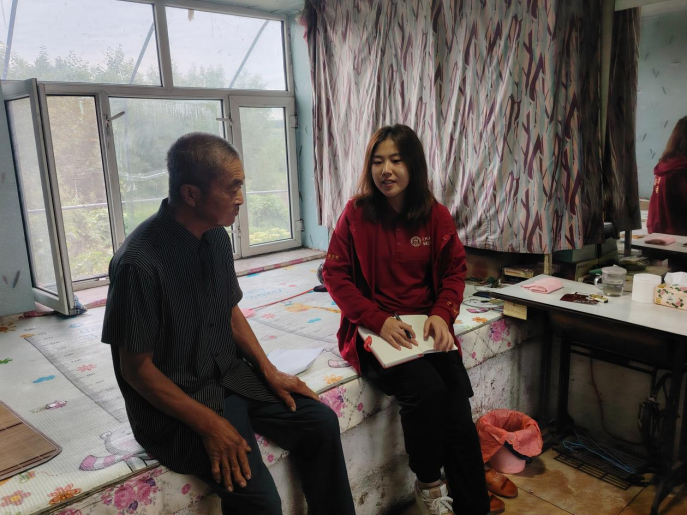 ▲本科生钟子佟访谈东郊镇厢兰五村谷家屯脱贫户王宪章
