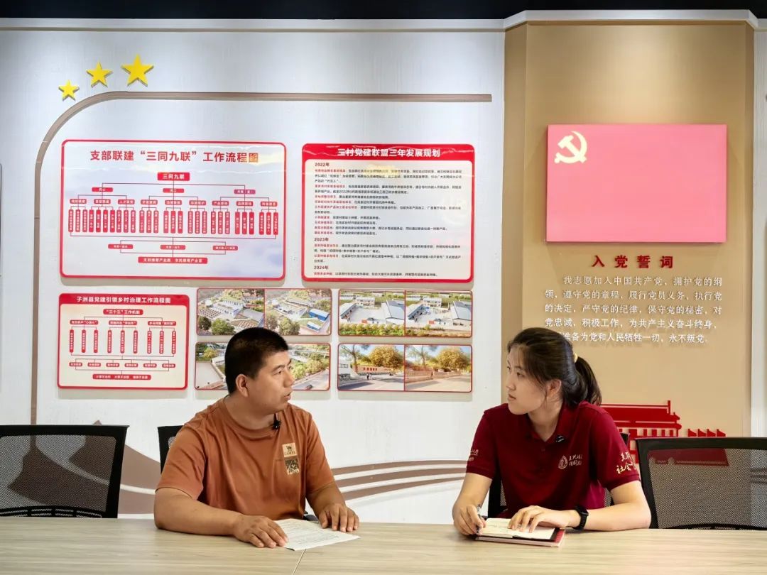 7月27日上午,调研团队抵达子洲县苗家坪镇董家湾村开展调研。董家湾村联合高家砭村和梁渠村创新性地推出支部联建“三同九联”这一工作模式。“三同九联”以“同心、同工、同富”为核心引领,以九大联动机制为实践路径。“同心”即聚焦思想与组织统一,“同工”即治理与环境协同,“同富”则是瞄准产业与利益共赢蓄积发展合力。