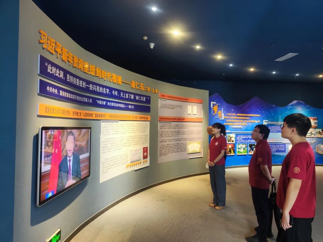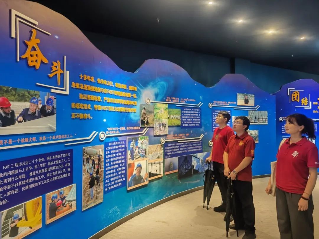 为深入学习贯彻习近平新时代中国特色社会主义思想和党的二十大精神,弘扬科学家精神,铸牢中华民族共同体意识,调研团参观了“时代楷模”南仁东纪念馆,这里不仅是缅怀南仁东先生卓越贡献的地方,更是传承和弘扬科学家精神的重要阵地。展馆系统展示了南仁东先生及其团队在FAST(500米口径球面射电望远镜)项目中的艰苦历程和辉煌成就。南仁东先生严谨求实、不畏艰难、勇于探索、忠于祖国、奉献人民的精神,深深打动了在场的每一个人。