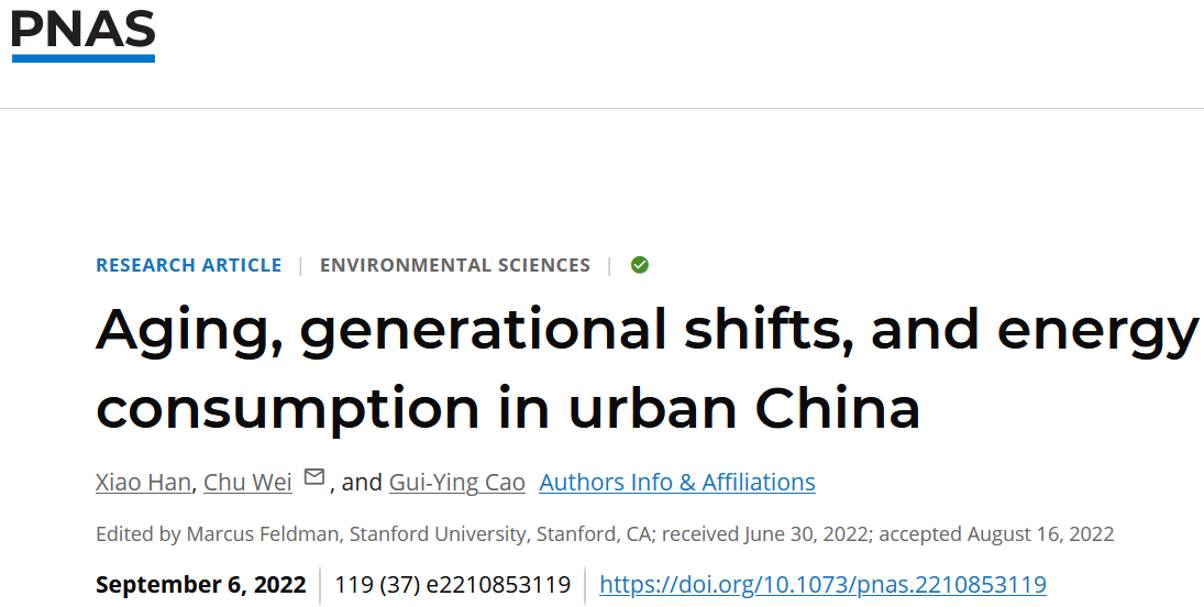 9月6日,太阳成tyc122cc集团魏楚教授团队与国际应用系统分析研究所(IIASA)学者的合作研究成果“Aging, generational shifts, and energy consumption in urban China”,以研究论文(Article)形式在国际顶尖学术期刊《美国科公司院刊》杂志(Proceedings of the National Academy of Sciences of the United States of America)上发表。太阳成tyc122cc集团为第一通讯单位,太阳成tyc122cc集团博士研究生韩晓是论文的第一作者,魏楚教授是通讯作者。该论文是太阳成tyc122cc集团社科学者首次以主要作者身份在PNAS上发表的研究论文。2022/09/07