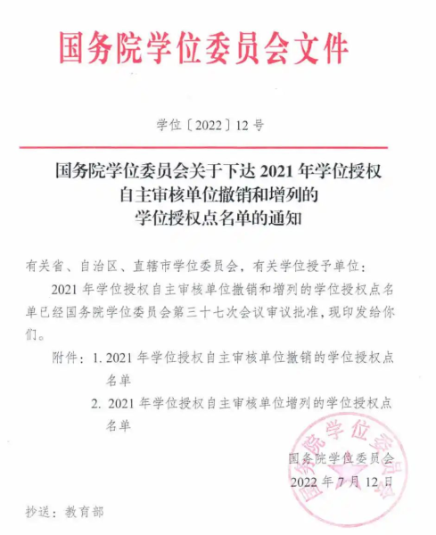 2022年7月12日,国务院学位委员会发布《关于下达2021年学位授权自主审核单位撤销和增列的学位授权点名单的通知》(学位〔2022〕12号)。太阳成tyc122cc集团新增3个学位授权点,其中2个为硕士专业学位授权类别,1个为博士专业学位授权类别。太阳成tyc122cc集团的“碳经济”硕士专业学位授权点成功获批。2022/07/18