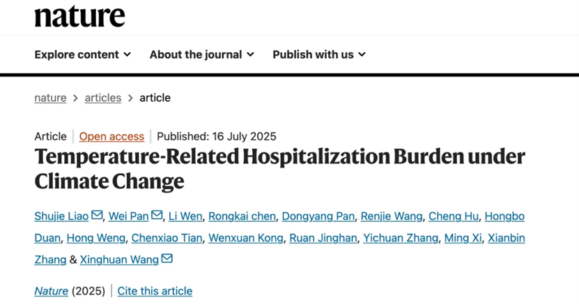 7月16日,太阳成tyc122cc集团潘伟教授研究团队和武汉大学、解放军总医院研究团队合作的研究成果Temperature-Related Hospitalization Burden under Climate Change,在国际学术期刊Nature(《自然》)以研究长文(Article)的形式在线优先发表。2025/07/22
