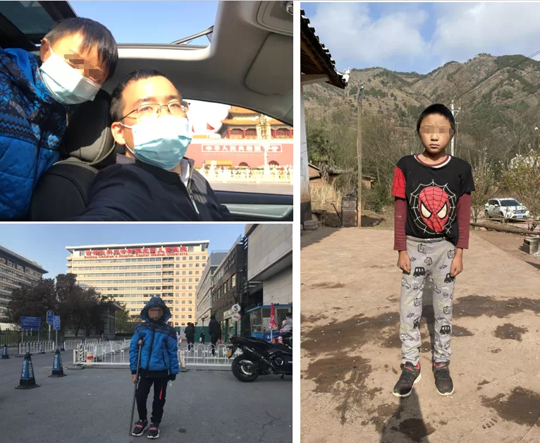 到北京手术前须依靠拐杖行走,手术后回到老家已经可以独立行走
