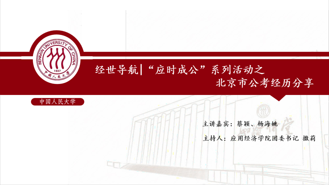 本次求职经验分享会邀请到了现就职于北京市东城区发展和改革委员会的2021届国民经济学员工蔡颖和现就职于北京市商务局的2021届国民经济学员工杨海姚,就北京公务员考试的笔面试准备、岗位内容、工作体验等方面展开分享,活动吸引了院内外约七十余人参与。